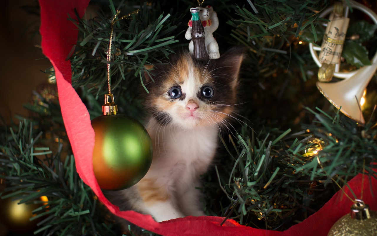 A little cute kitten is sitting on a festive Christmas tree for the new year Desktop wallpapers 1280x800
