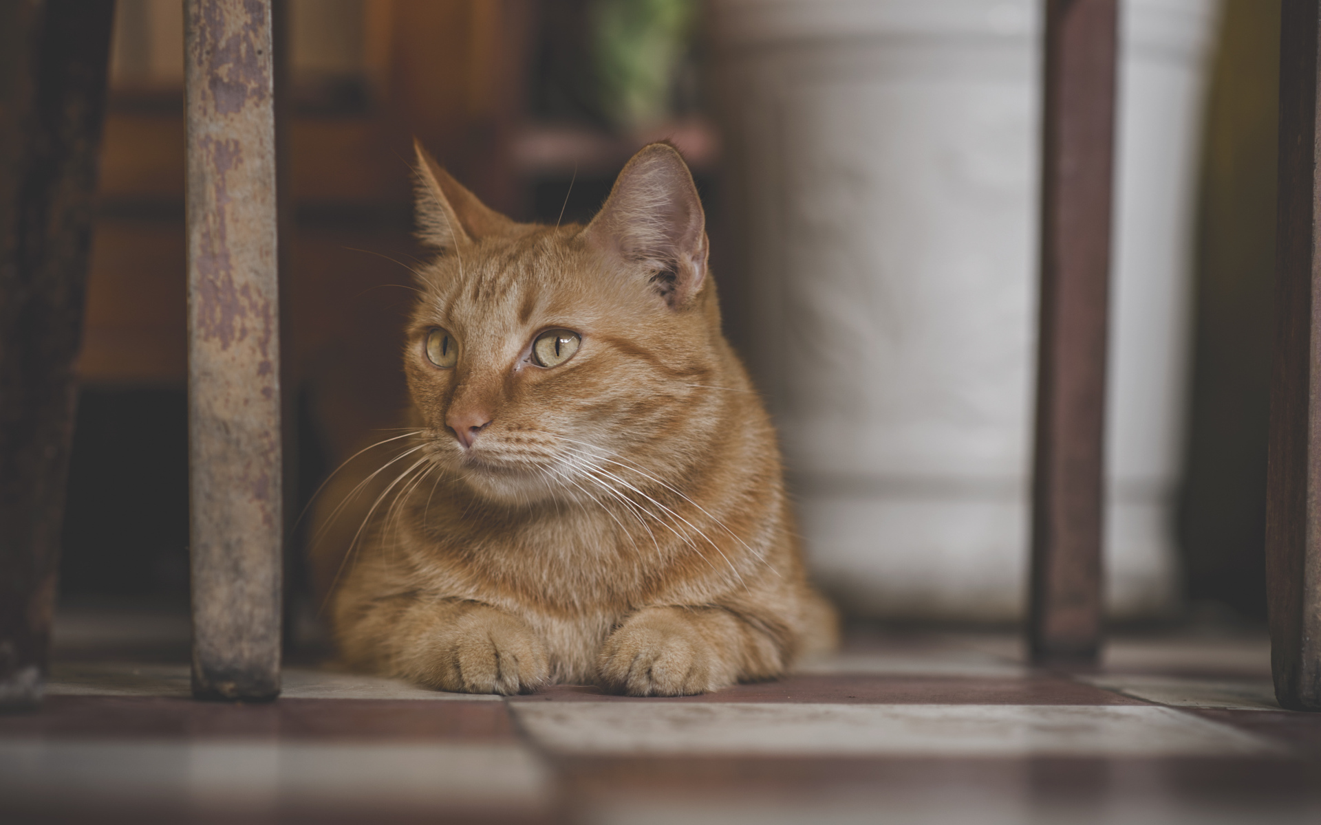 A big red cat lies under a chair Desktop wallpapers 1920x1200