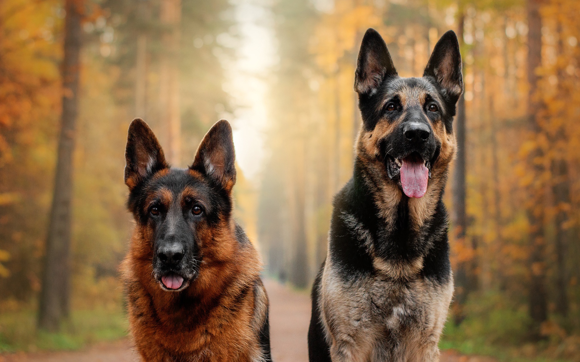 Two beautiful German Shepherd Dogs with tongue hanging out in the forest Desktop wallpapers 1920x1200