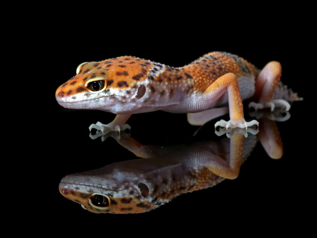 Leopard gecko close up in reflection on a black background Desktop wallpapers 1024x768