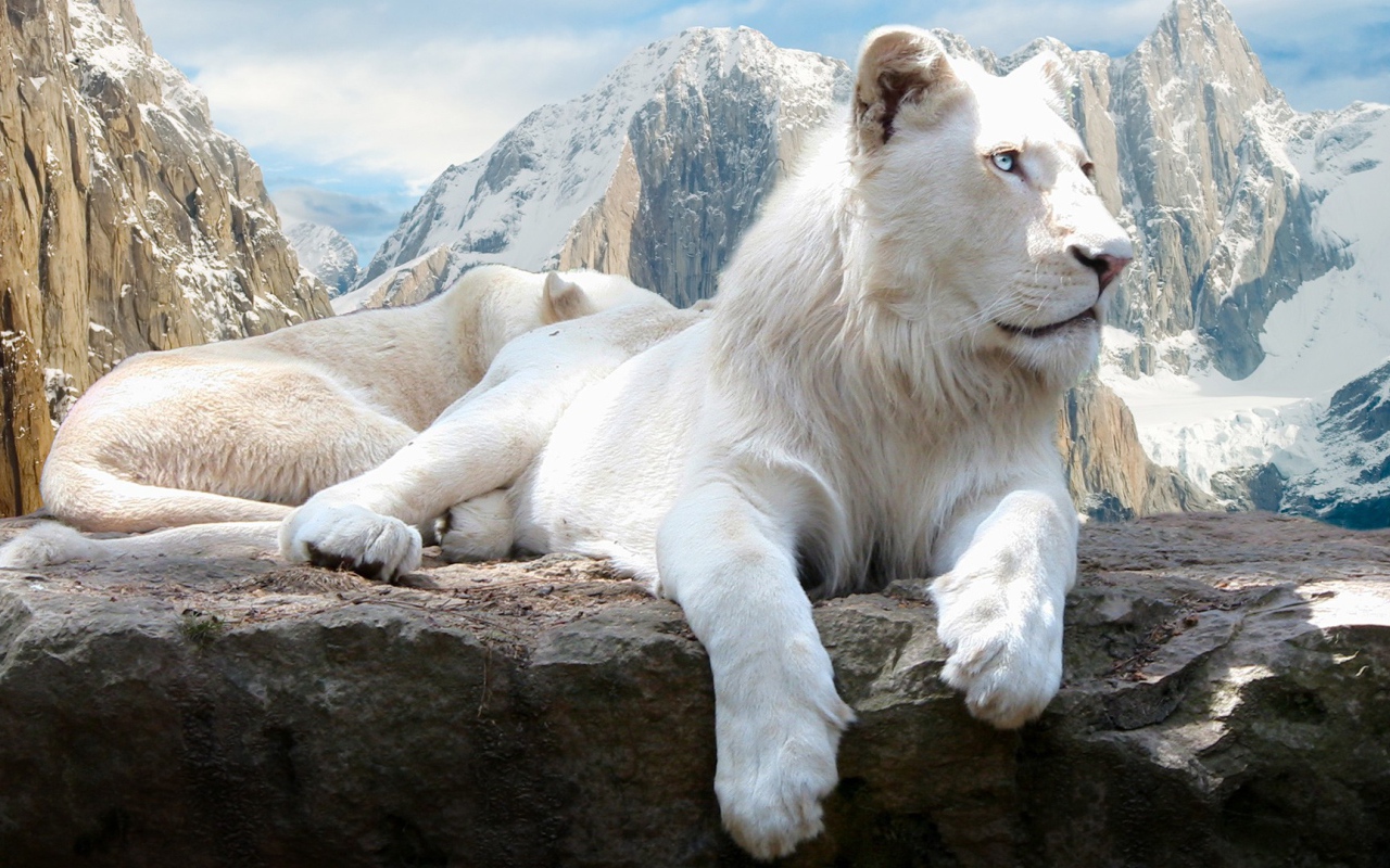 Blue-eyed white lion on a rock Desktop wallpapers 1280x800