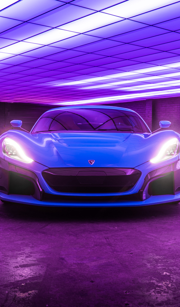 Sports car Rimac C Two California Edition, 2018 with the lights on Desktop wallpapers 600x1024