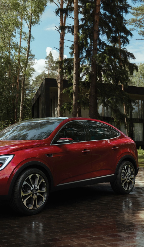 Red stylish SUV Renault Arkana, 2018 in the forest Desktop wallpapers 600x1024