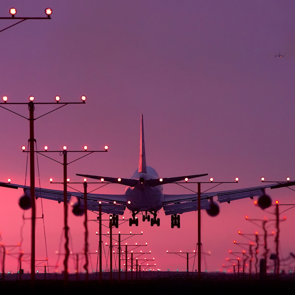 A passenger plane is landing at sunset Desktop wallpapers 1024x1024