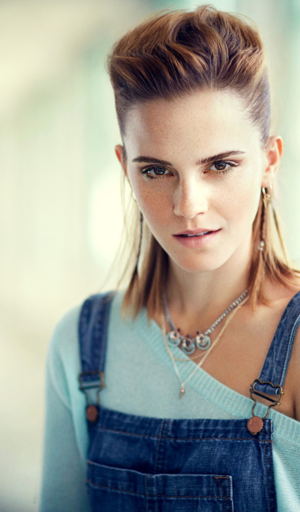 Stylish actress Emma Watson with denim overalls Desktop wallpapers 600x1024