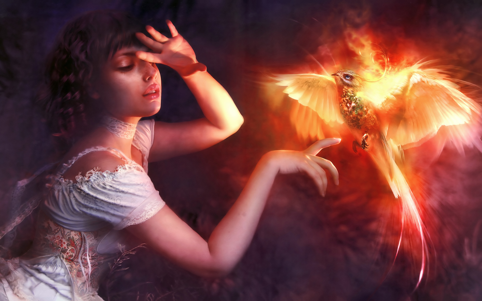 Beautiful girl with a mythical phoenix bird - 3992x2408