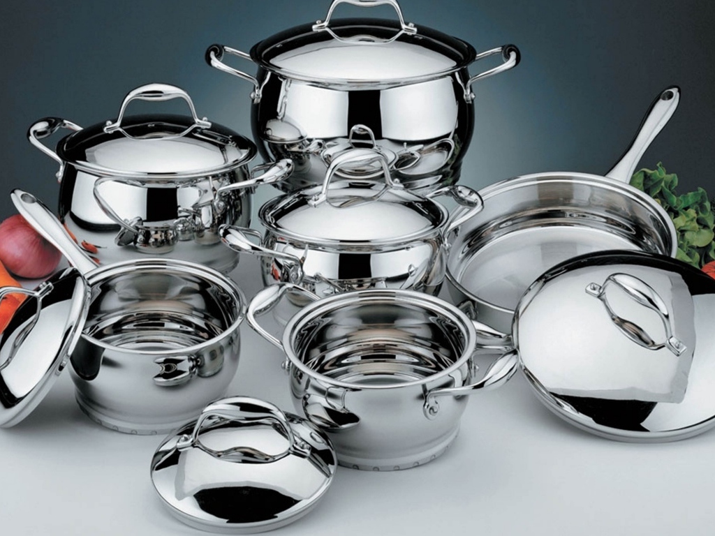 A set of beautiful new shiny dishes in the kitchen Desktop wallpapers 1024x768
