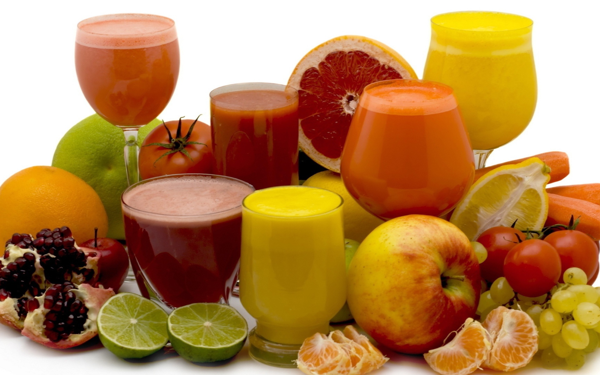 Different fresh juices on a white background with fruits Desktop wallpapers 1920x1200