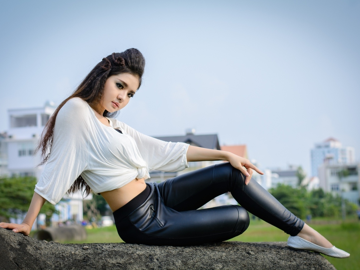 Asian girl in black leather pants Desktop wallpapers 1152x864