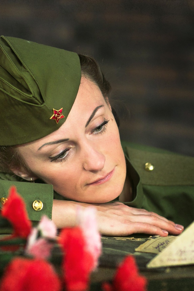 Girl in uniform with a bouquet of carnations and a letter for May 9