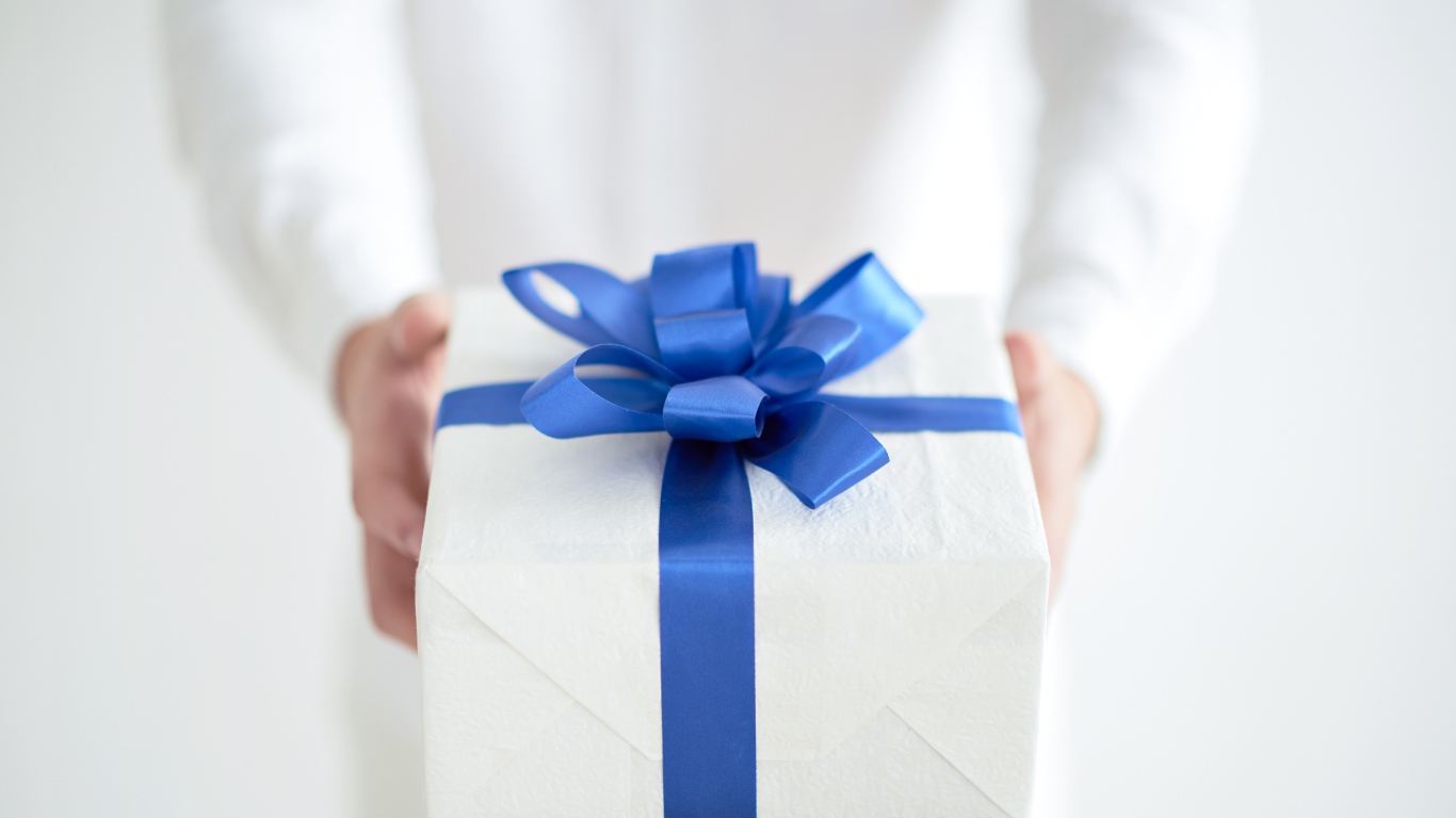Gift with a blue bow in hands Desktop wallpapers 1366x768