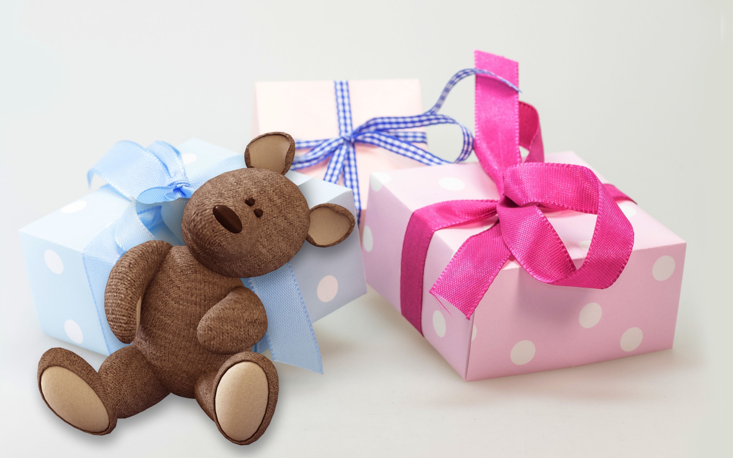 Gifts and teddy bear on a white background Desktop wallpapers 2560x1600