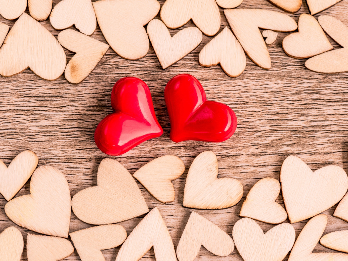 Two red hearts on a table with wooden hearts Desktop wallpapers 1400x1050