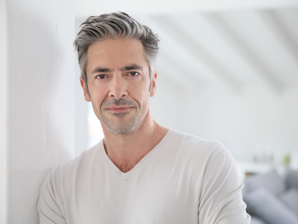 Gray-haired stylish man against the wall Desktop wallpapers 1152x864