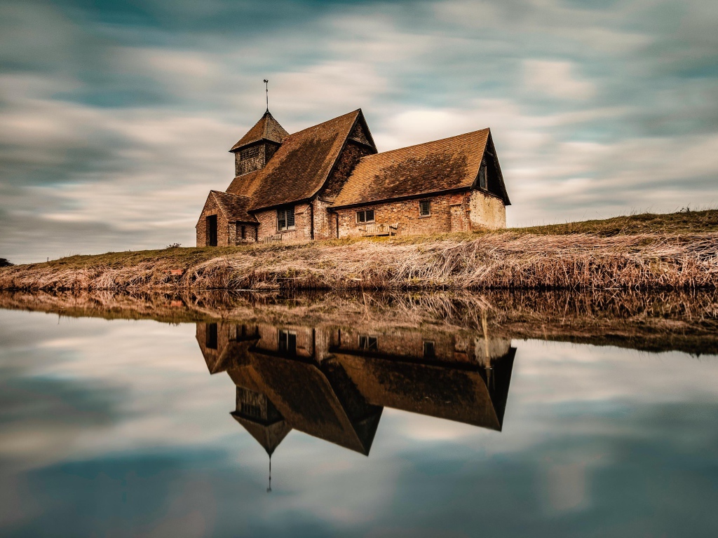 An old house by the river is reflected in the water Desktop wallpapers 1024x768