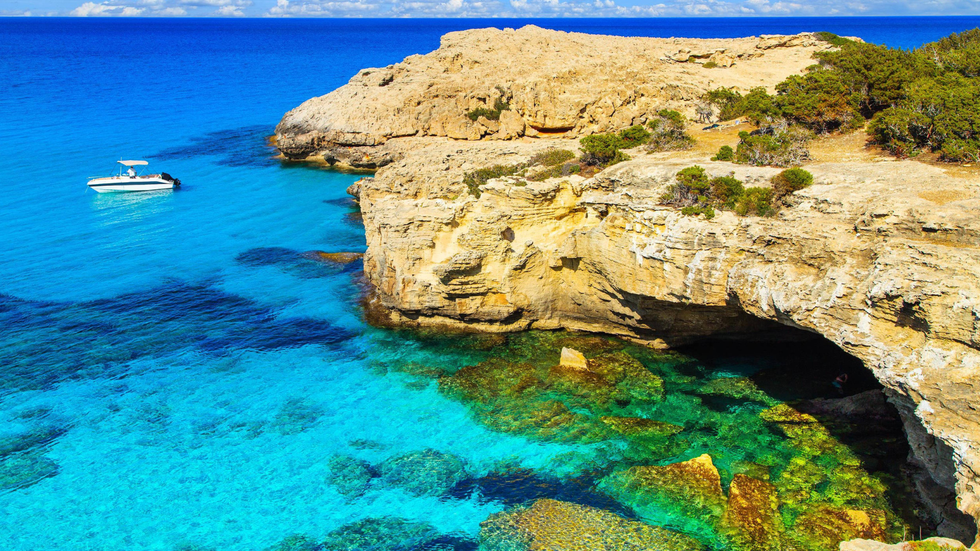 Crystal water and stone caves Cape Greco, Cyprus Desktop wallpapers 1920x1080