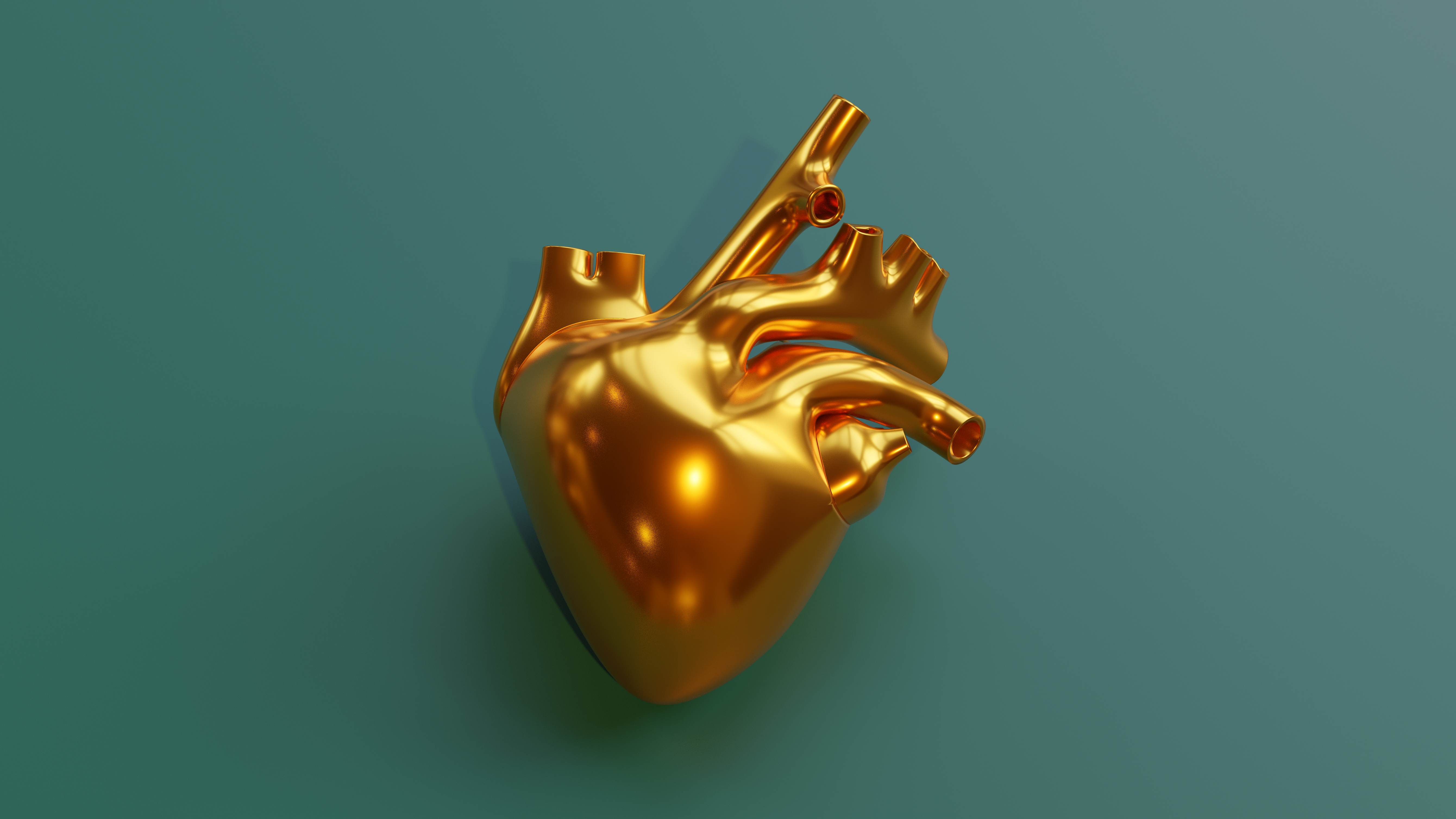 Золотое 3д сердце на зеленом фоне - 5360x3015