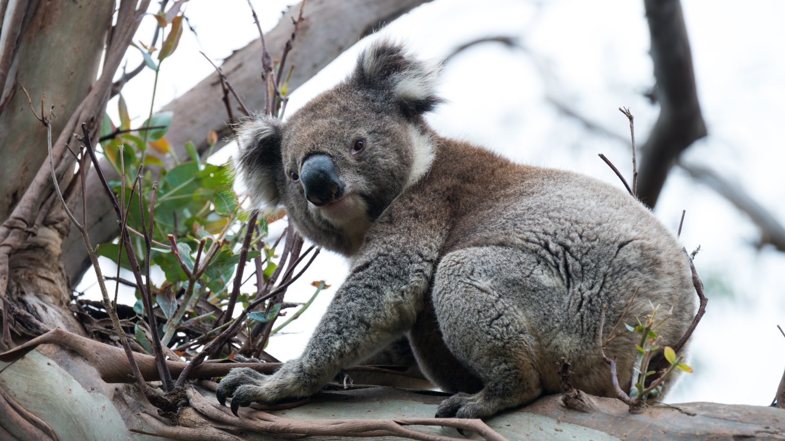 Большая коала сидит на ветке дерева Обои для рабочего стола 1600x900