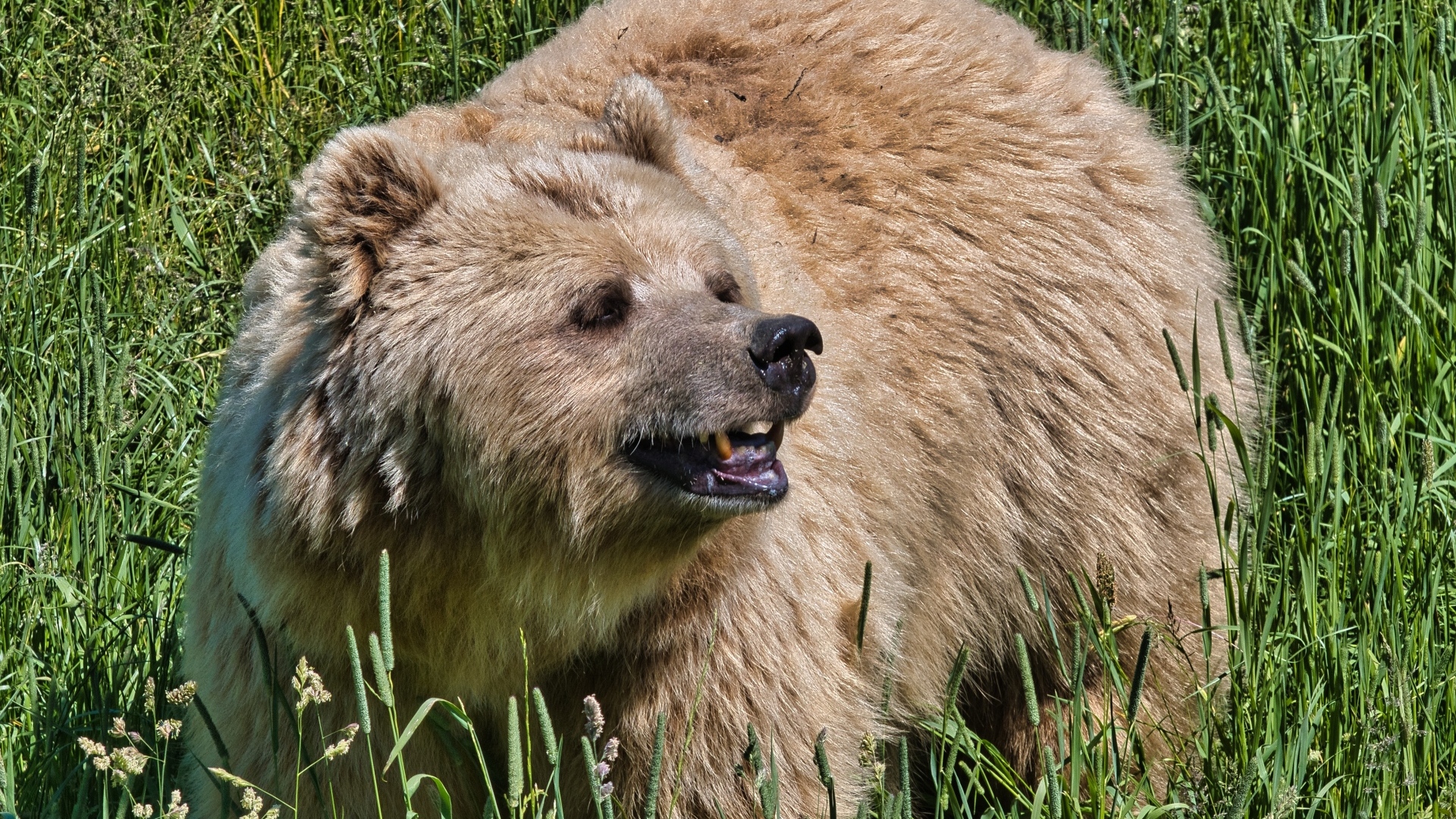 Большой бурый медведь в зеленой траве Обои для рабочего стола 1920x1080