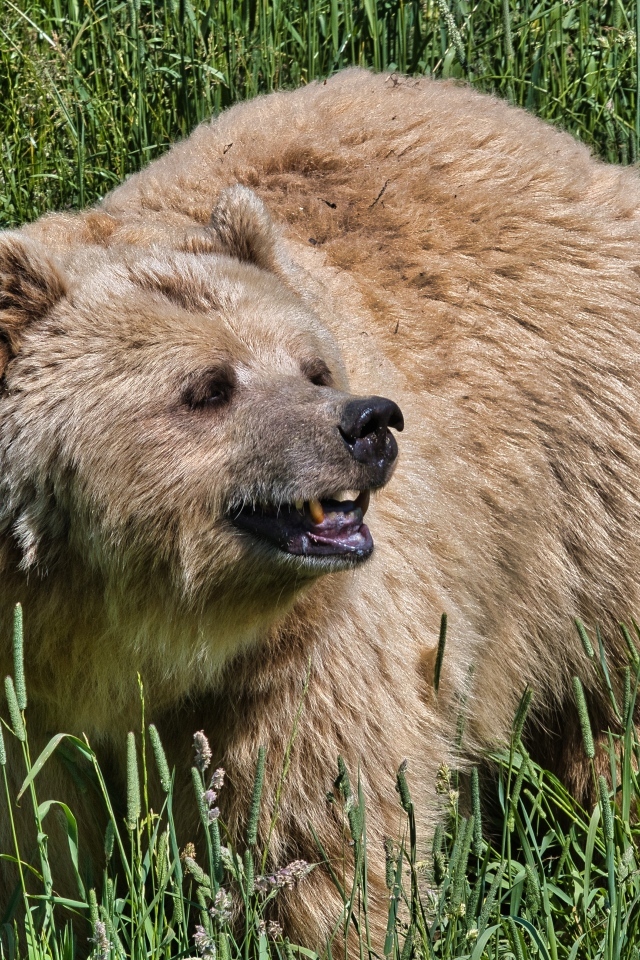 Большой бурый медведь в зеленой траве Обои для рабочего стола 640x960