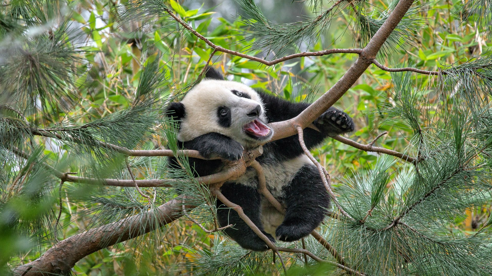 Панда на еловых ветвях - 1920x1080
