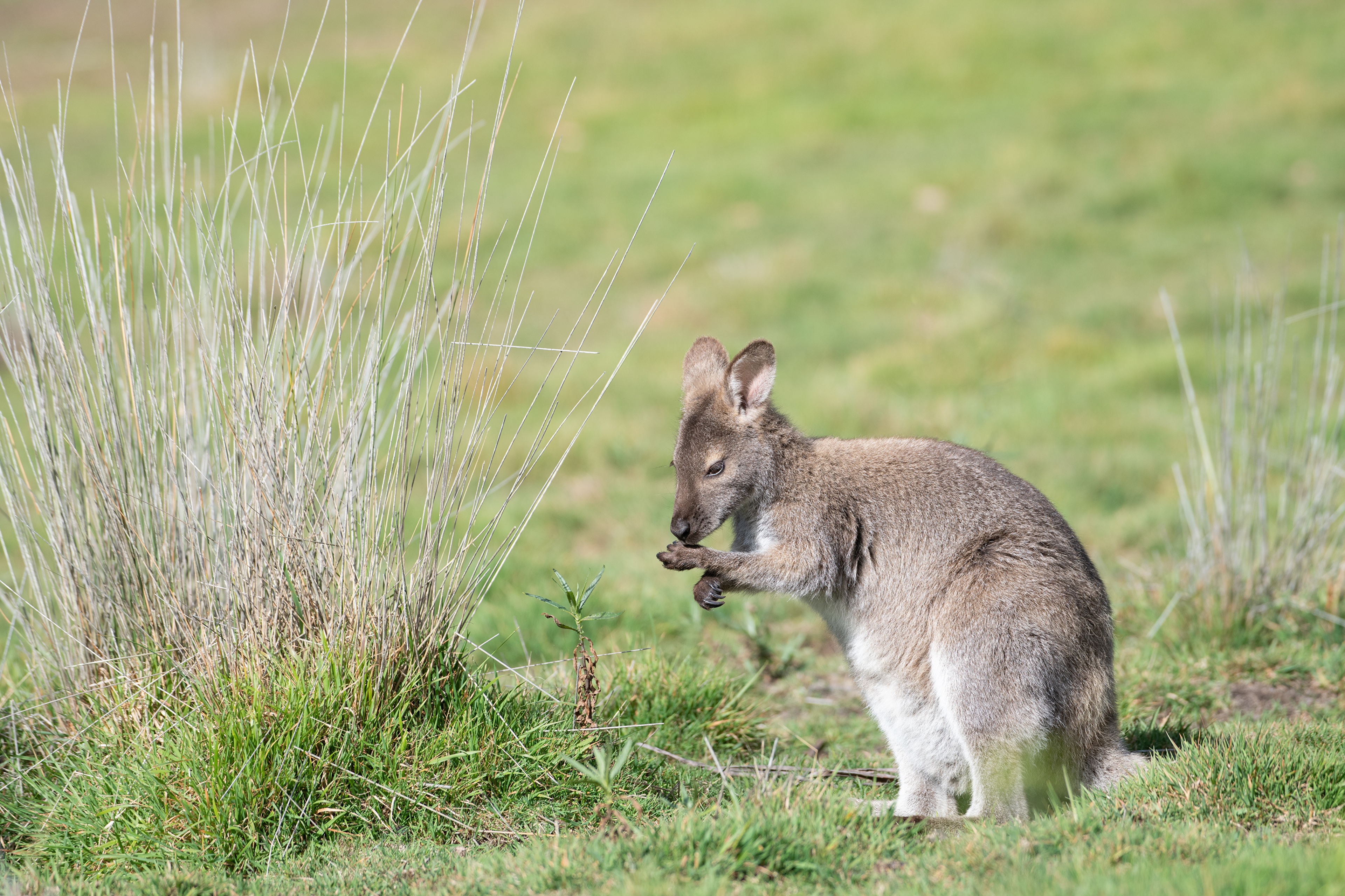Серый кенгуру сидит на зеленой траве - 3840x2560