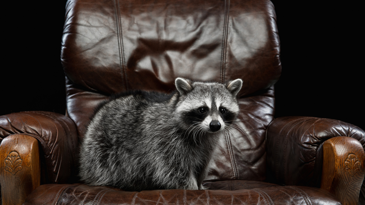 Большой серый енот на кожаном кресле Обои для рабочего стола 1280x720