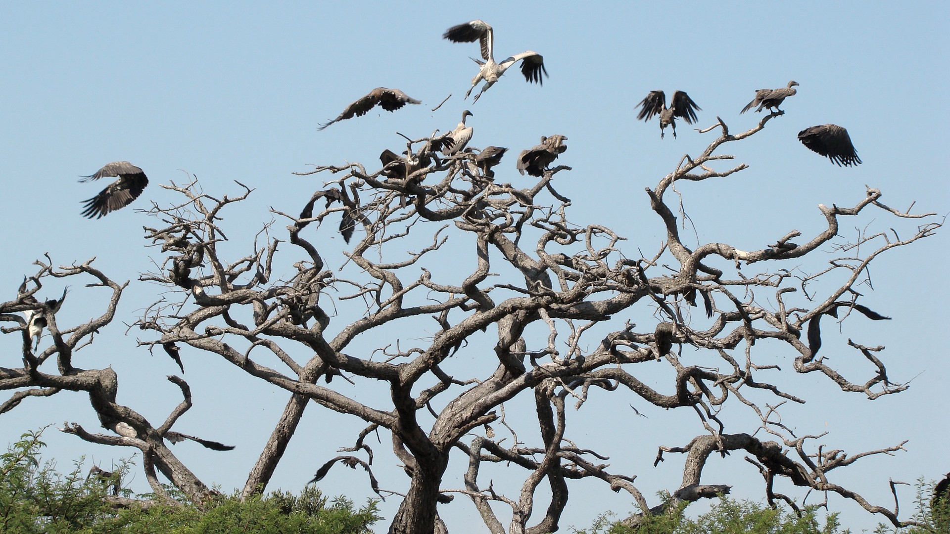 Птицы падальщики на ветвях сухого дерева - 1920x1080