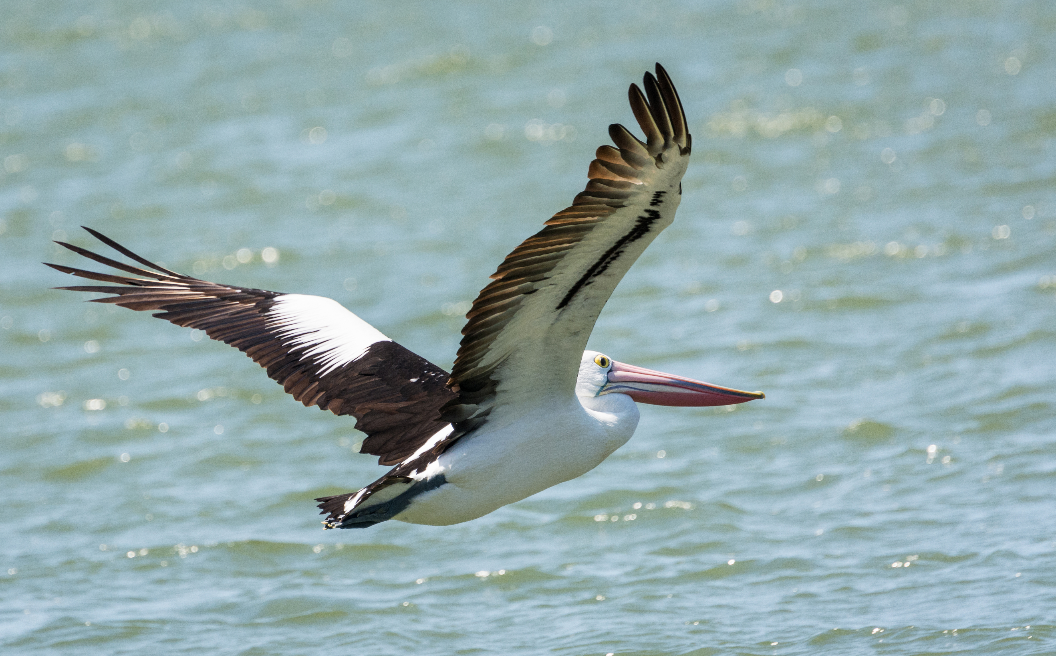 Большая птица пеликан летит над водой - 3700x2300