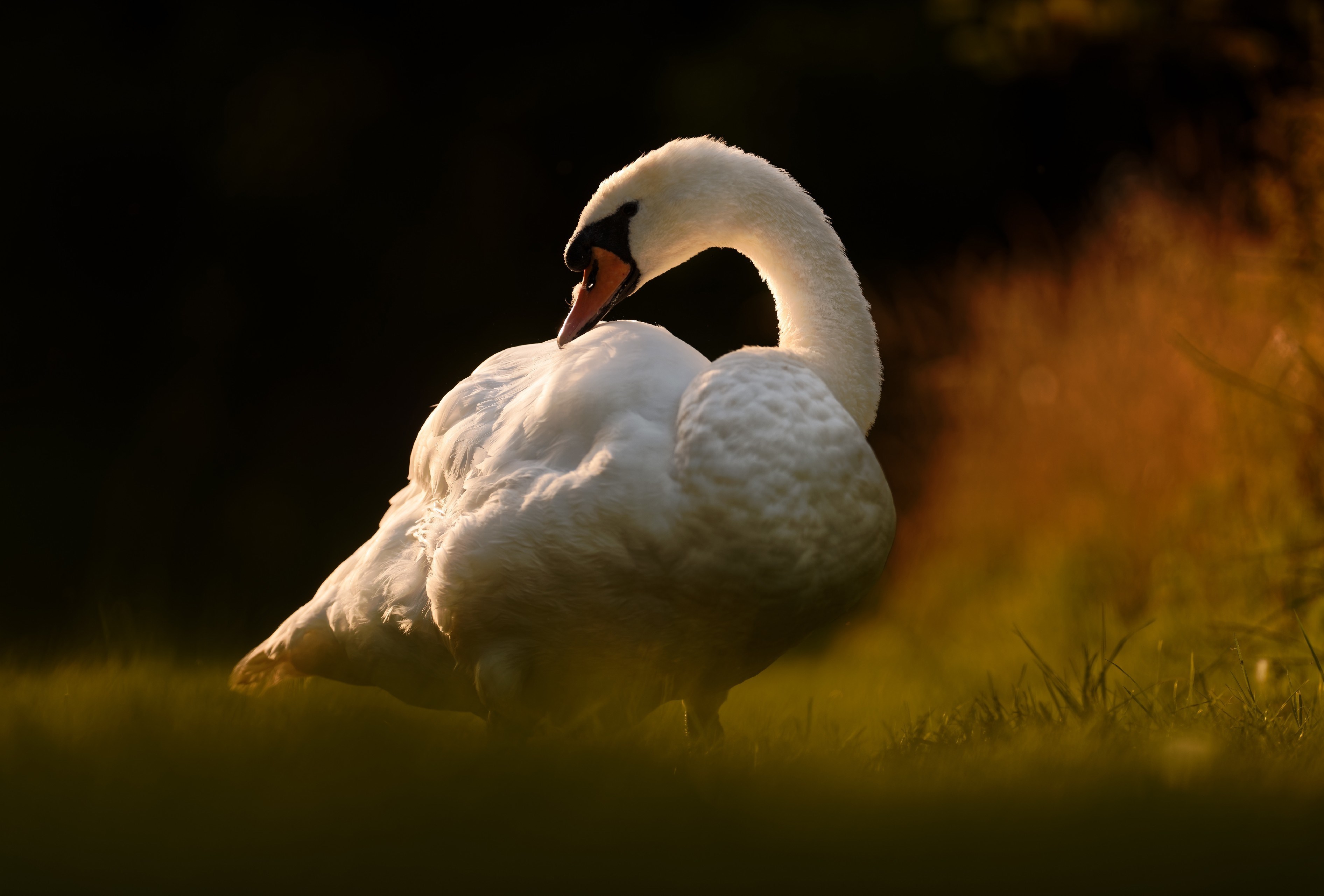 Большой белый лебедь стоит на зеленой траве - 3784x2562