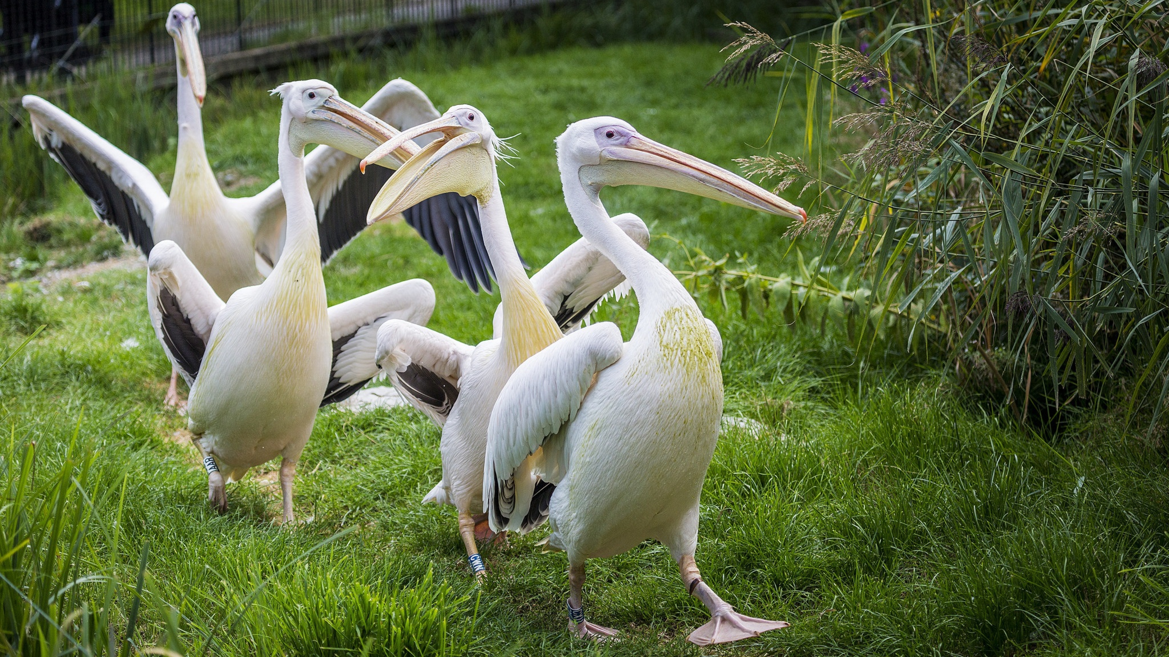 Четыре пеликана идут по зеленой траве - 3840x2160