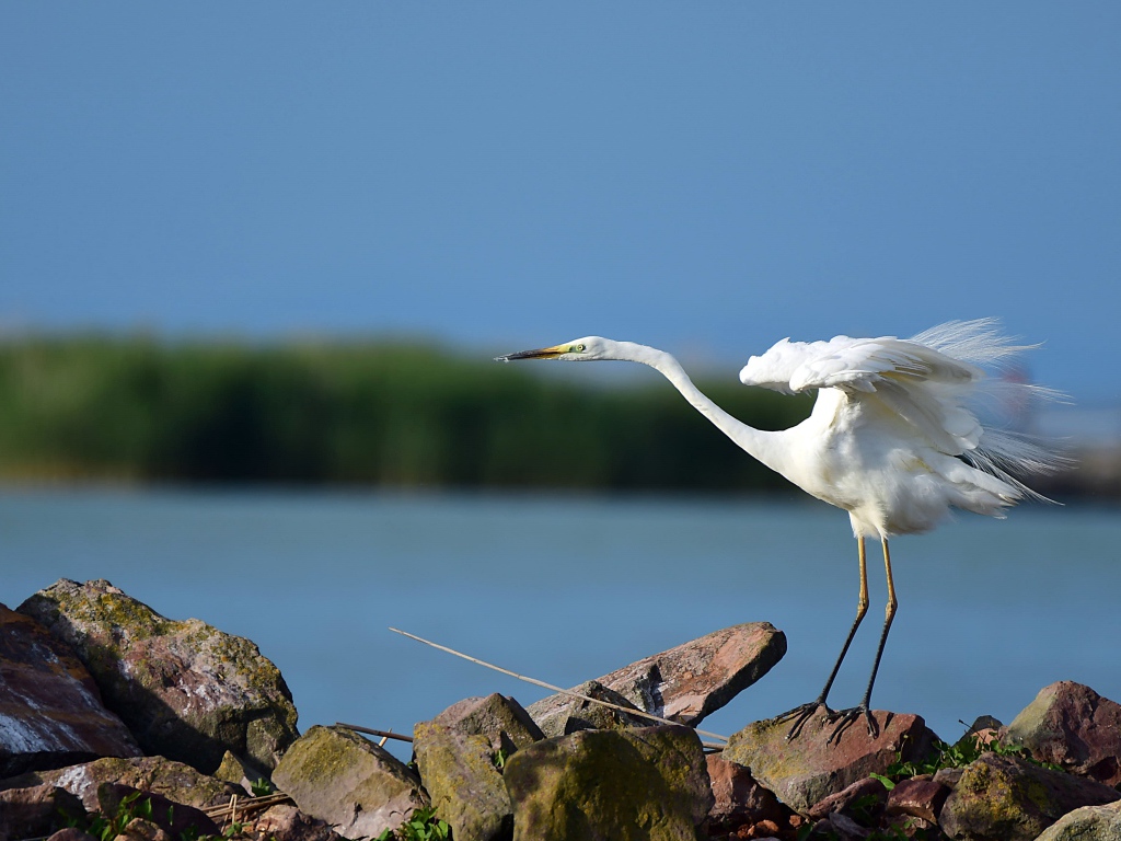 Белая цапля на камне готовится к взлету Обои для рабочего стола 1024x768