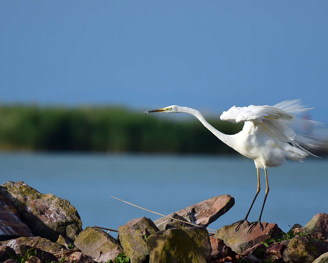 Белая цапля на камне готовится к взлету Обои для рабочего стола 1280x1024