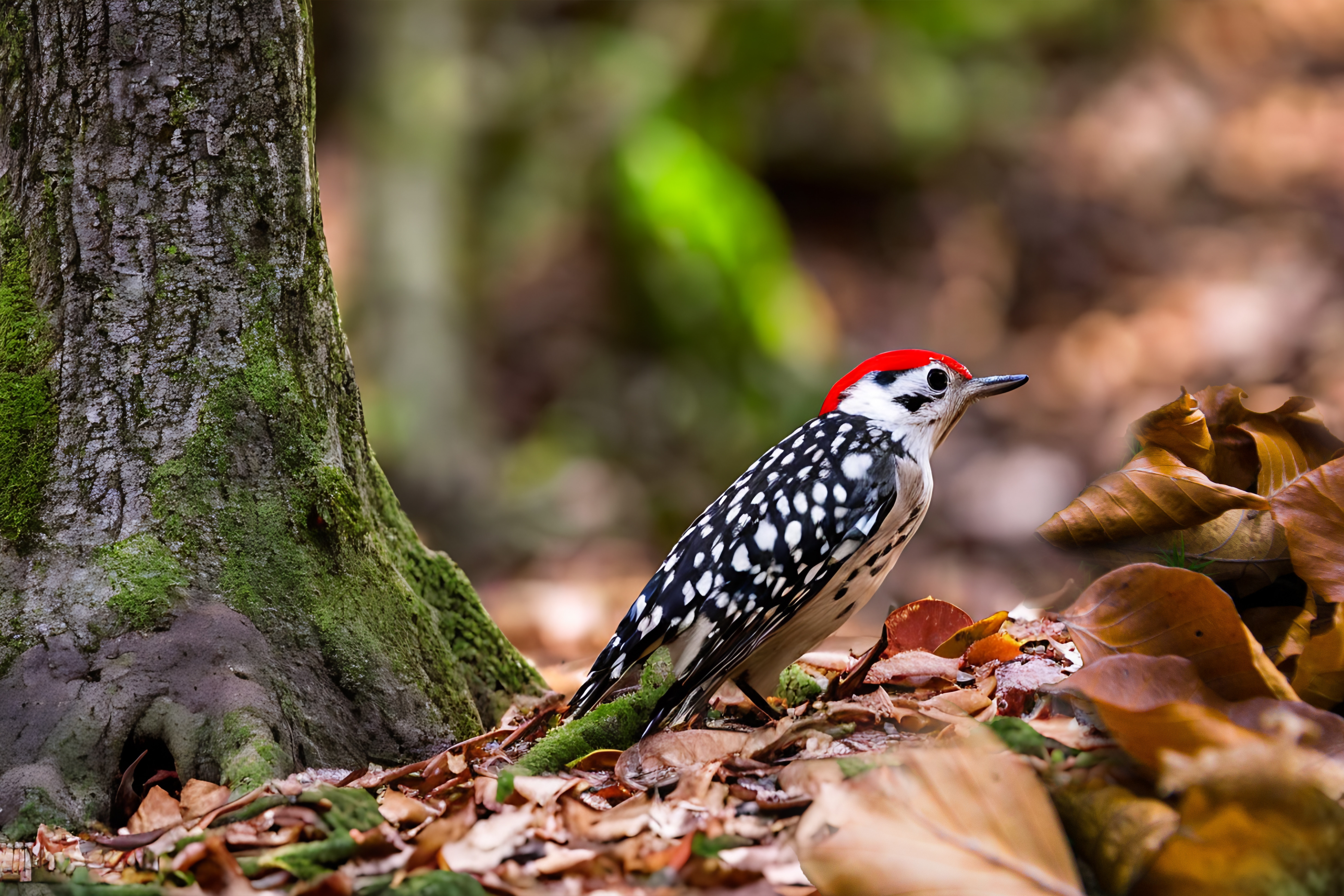 Пятнистый дятел сидит на опавшей листве - 4938x3292