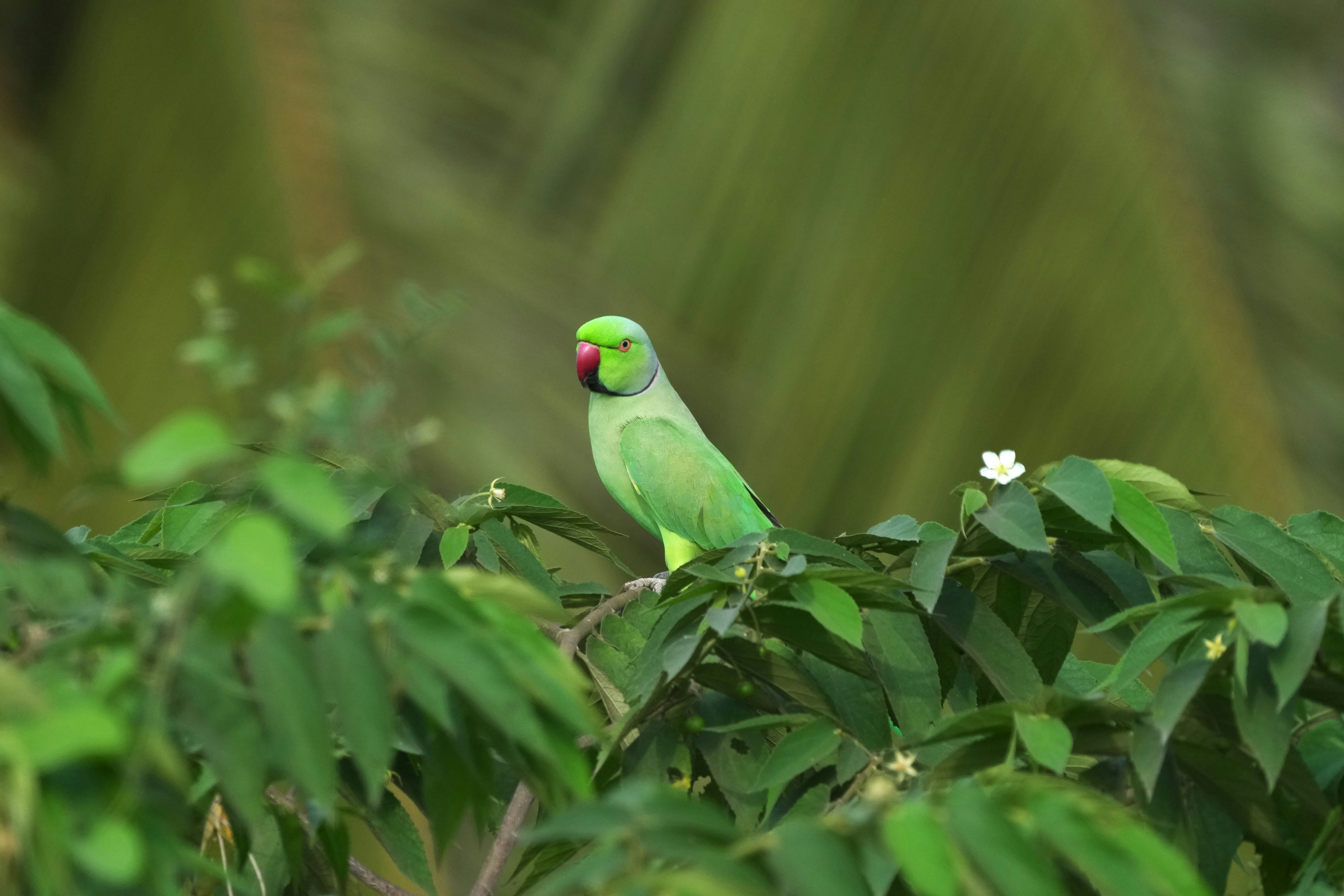 Зеленый Индийский кольчатый попугай в листьях - 6208x4138