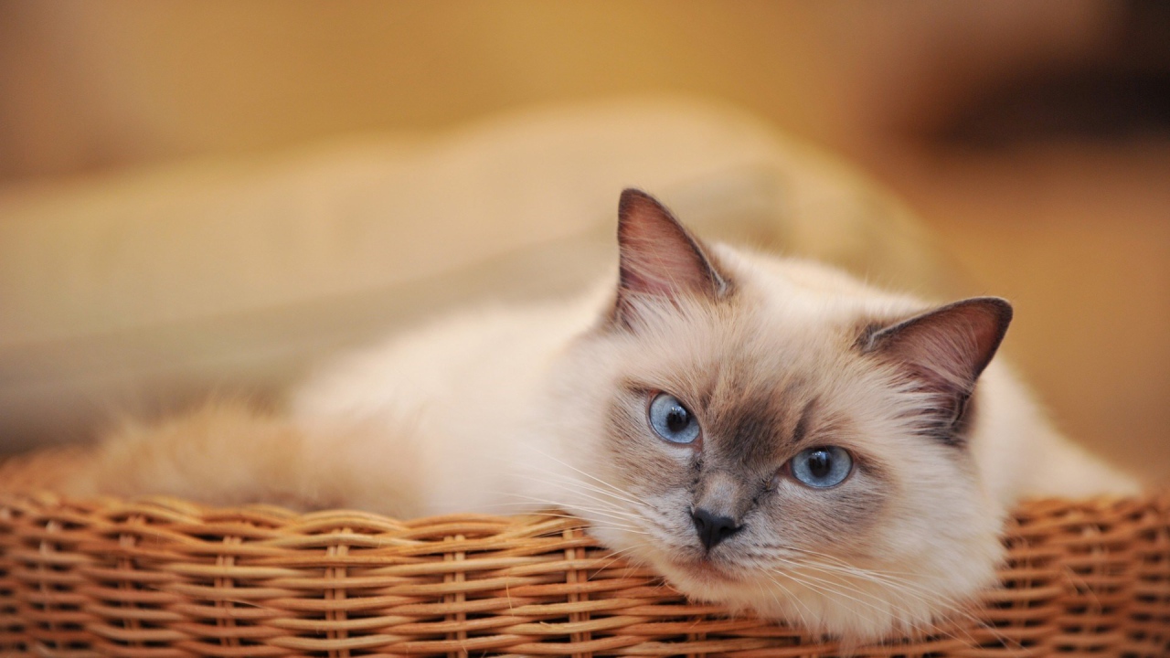 Пушистая сиамская кошка в соломенной корзине - 1920x1200