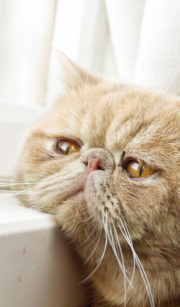 Грустный рыжий персидский кот смотрит в окно Обои для рабочего стола 600x1024