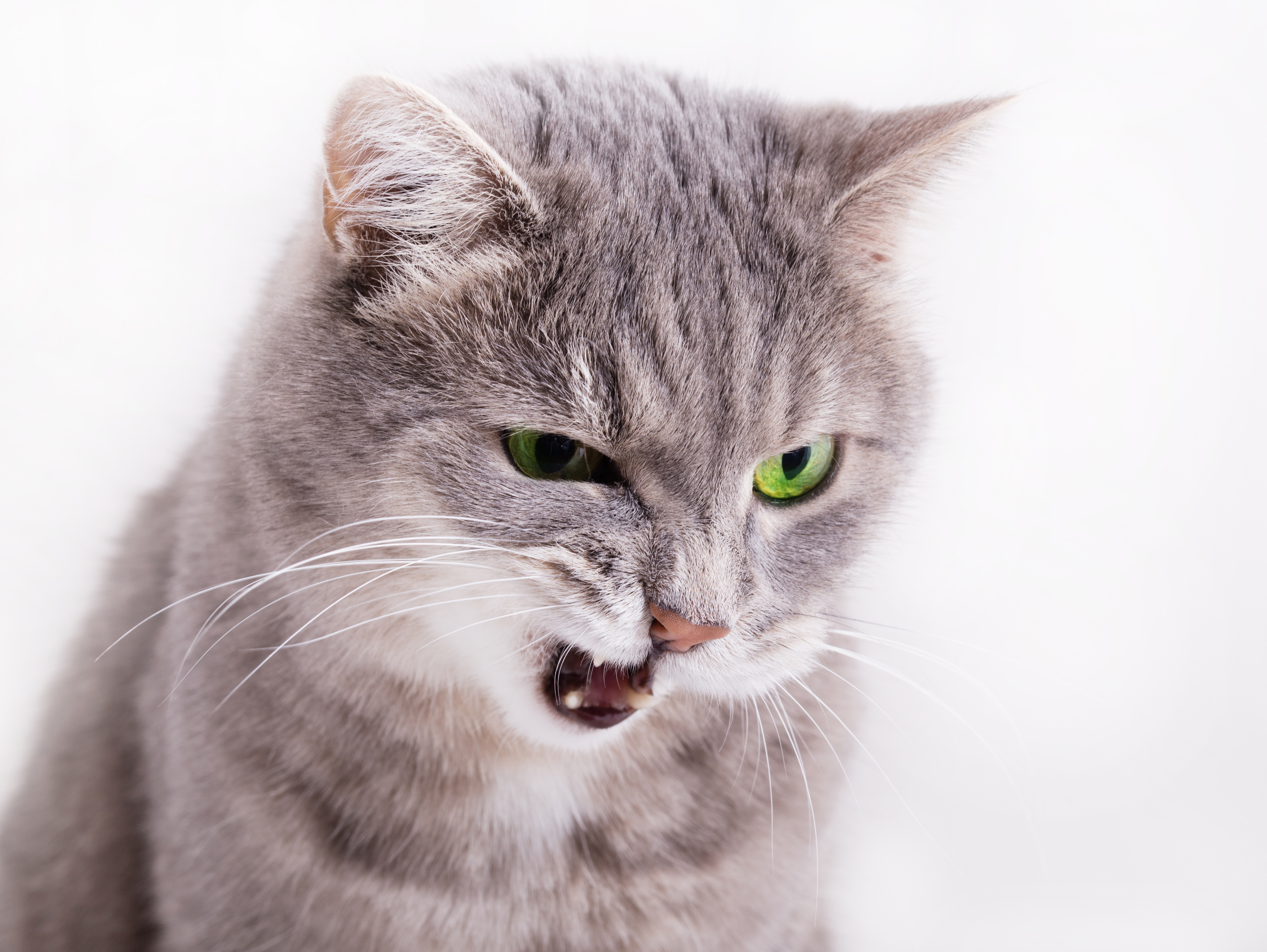 Хмурый взгляд серой кошки на белом фоне - 4695x3528