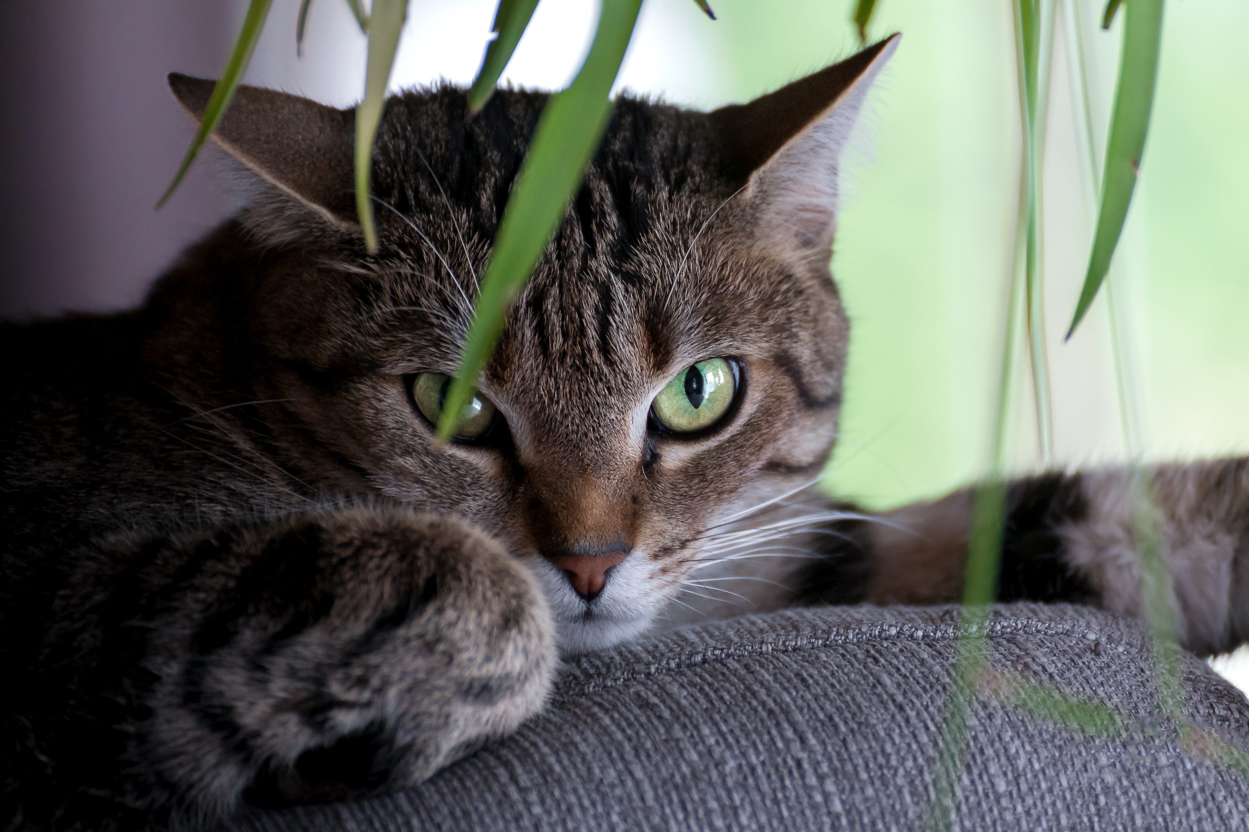 Зеленоглазый серый кот лежит на диване - 4101x2734