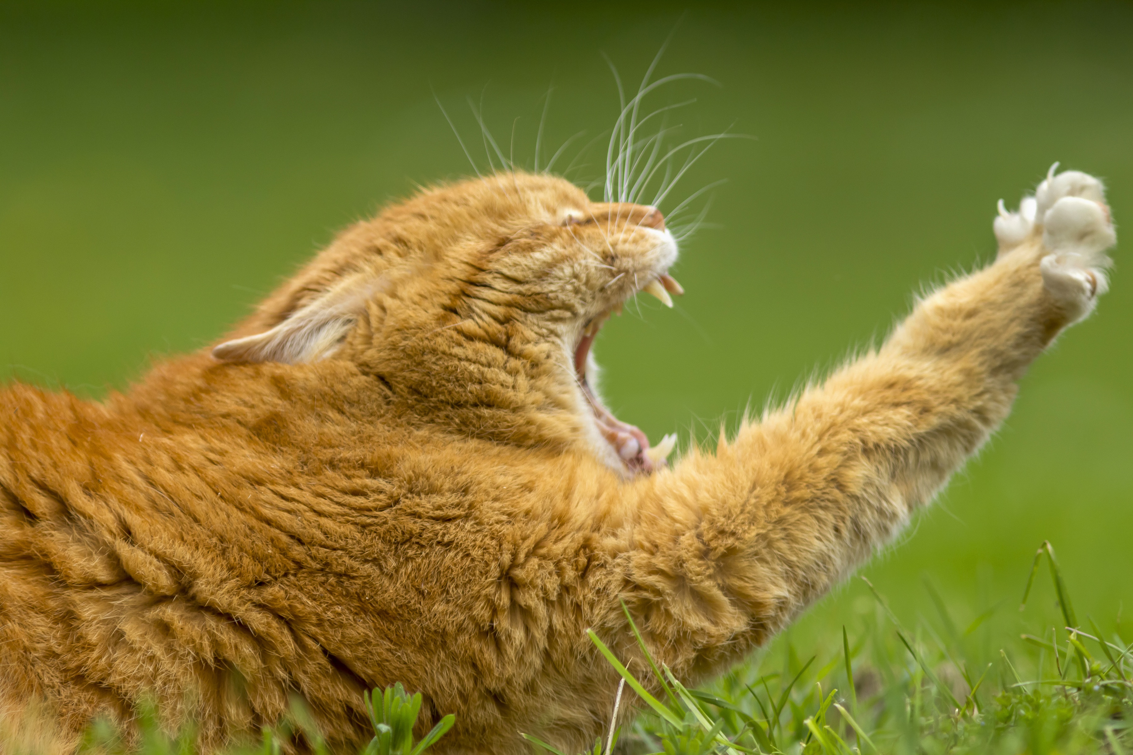 Рыжий зевающий кот на зеленой траве - 3600x2400