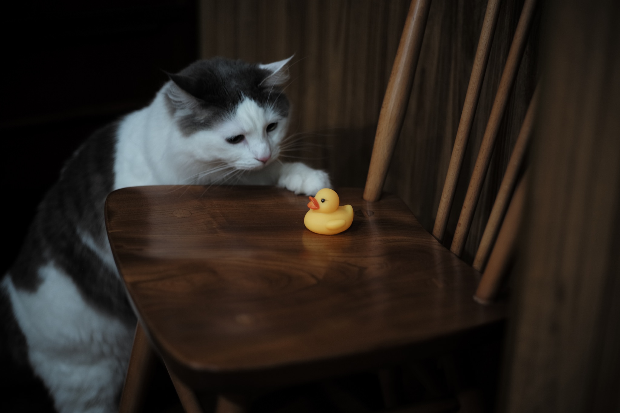Кот с желтой резиновой уточкой на стуле - 2048x1365
