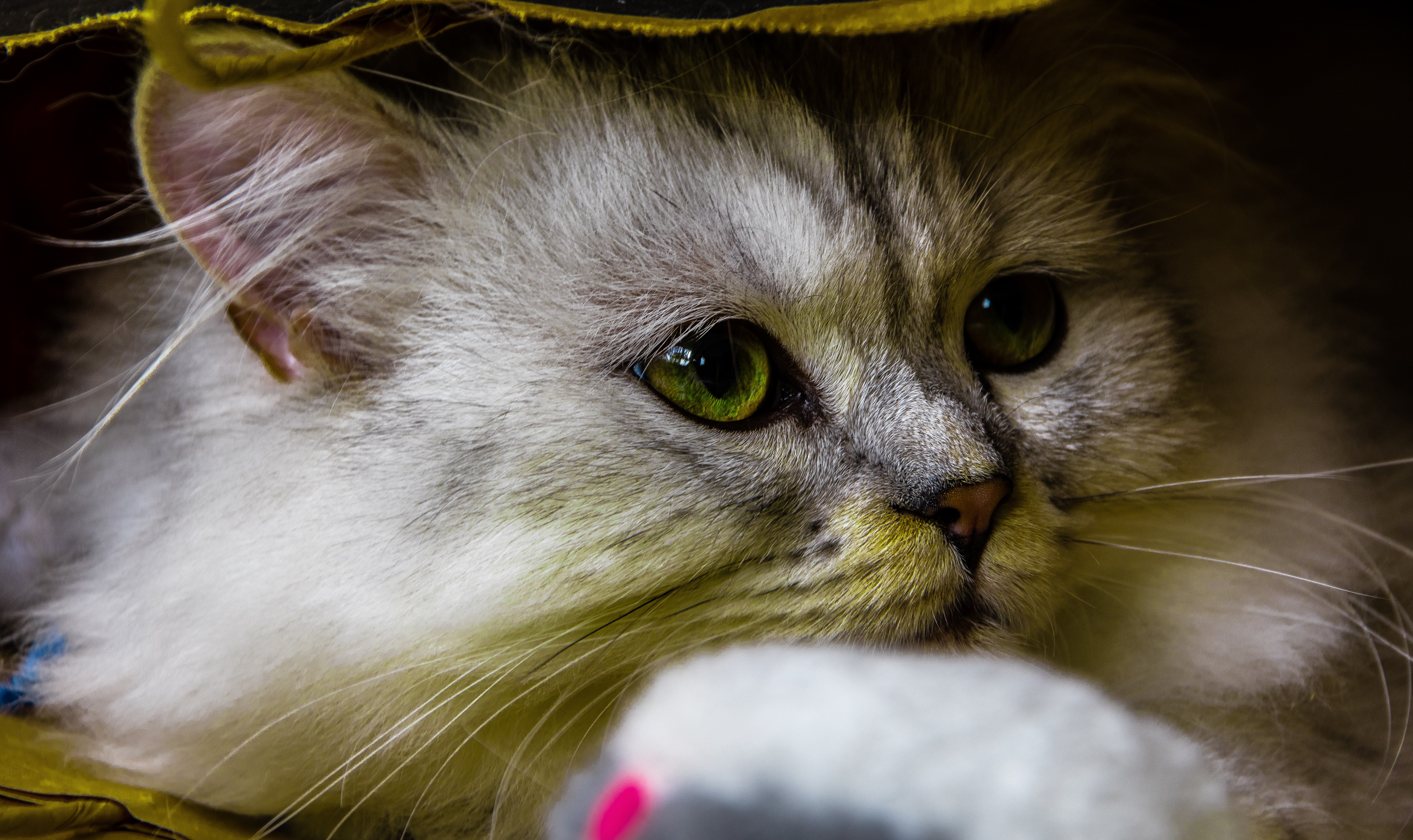Красивый пушистый зеленоглазый кот под одеялом - 5568x3311