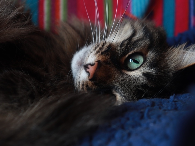 Обои: Красивый серый кот с зелеными глазами лежит на кровати