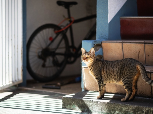Обои: Любопытный серый кот стоит на ступеньках