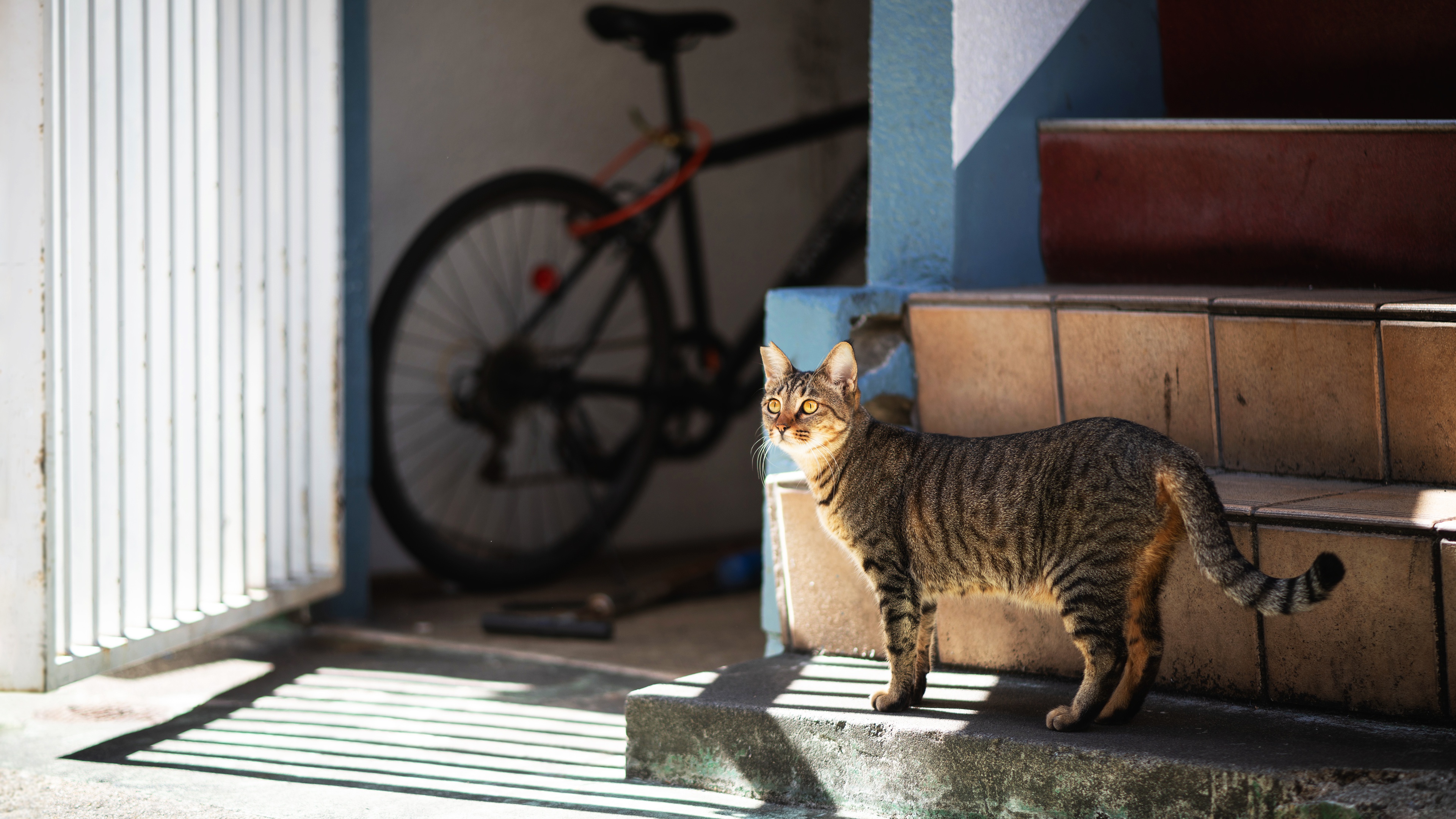 Любопытный серый кот стоит на ступеньках - 3840x2160