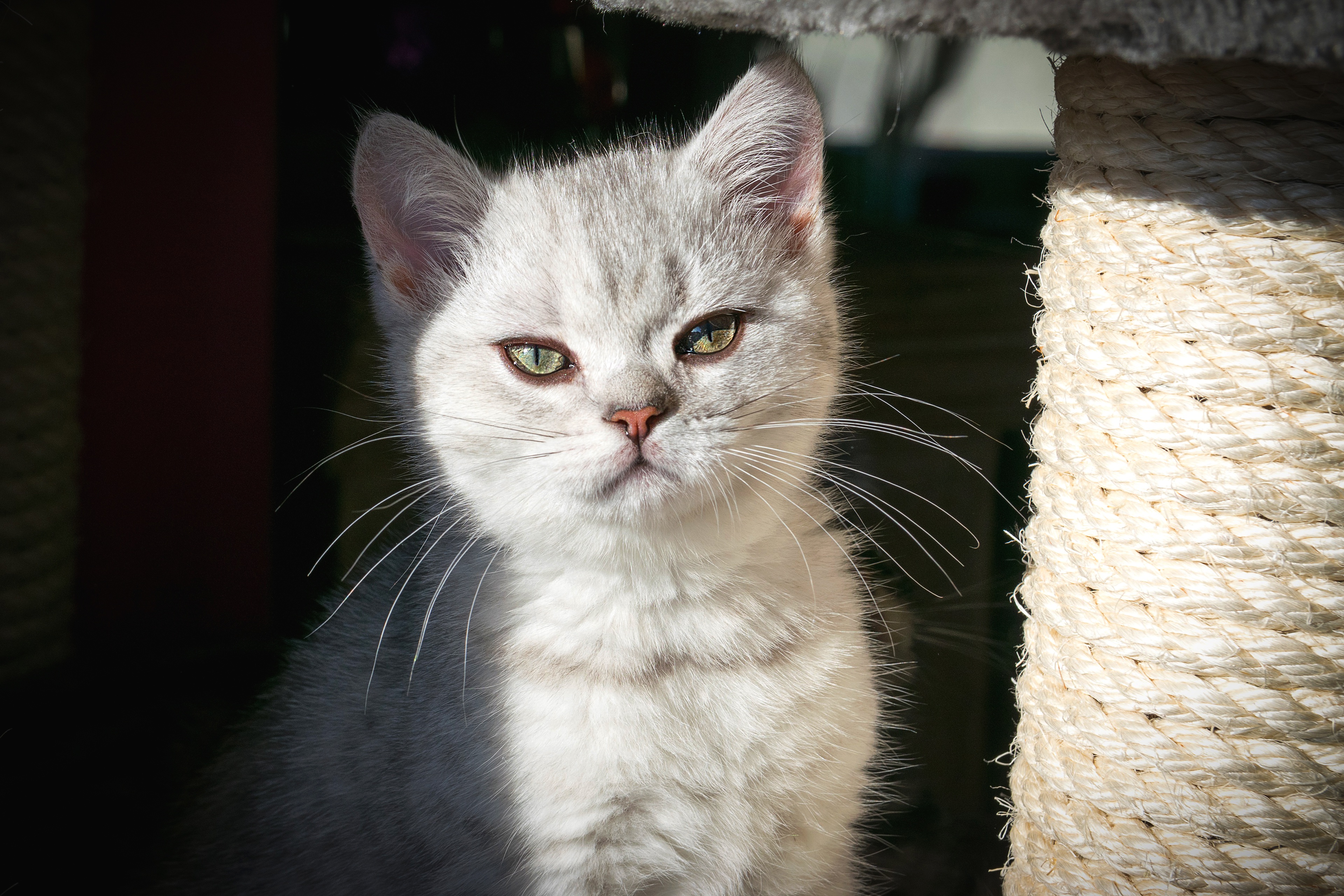 Породистый серый котенок сидит у когтеточки - 3840x2560