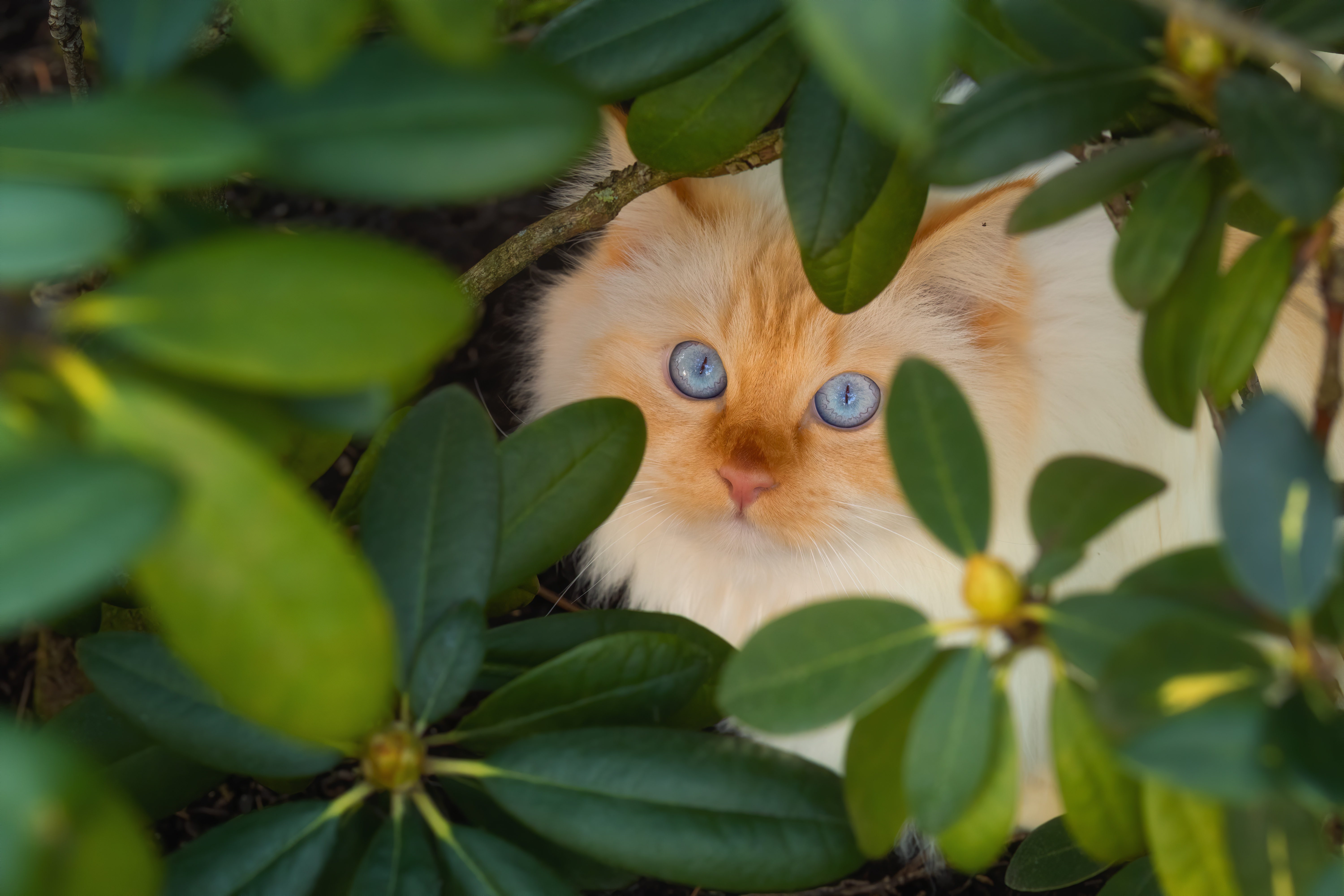 Красивый бежевый голубоглазый кот в зеленых листьях - 6000x4000