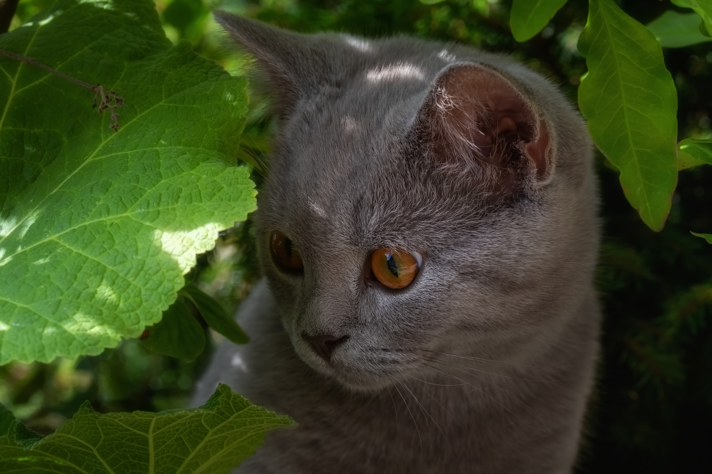 Маленький британский котенок в зеленых листьях - 3000x2000