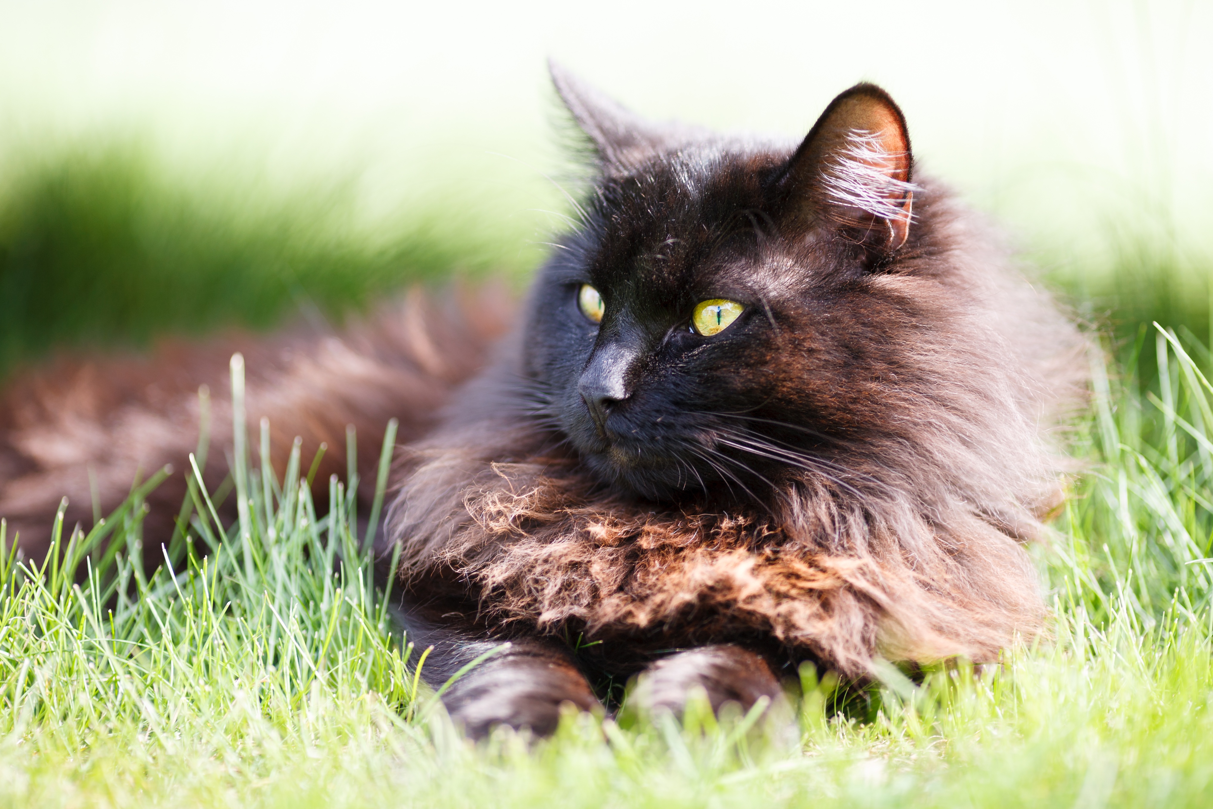 Пушистый черный кот лежит на зеленой траве - 4069x2713
