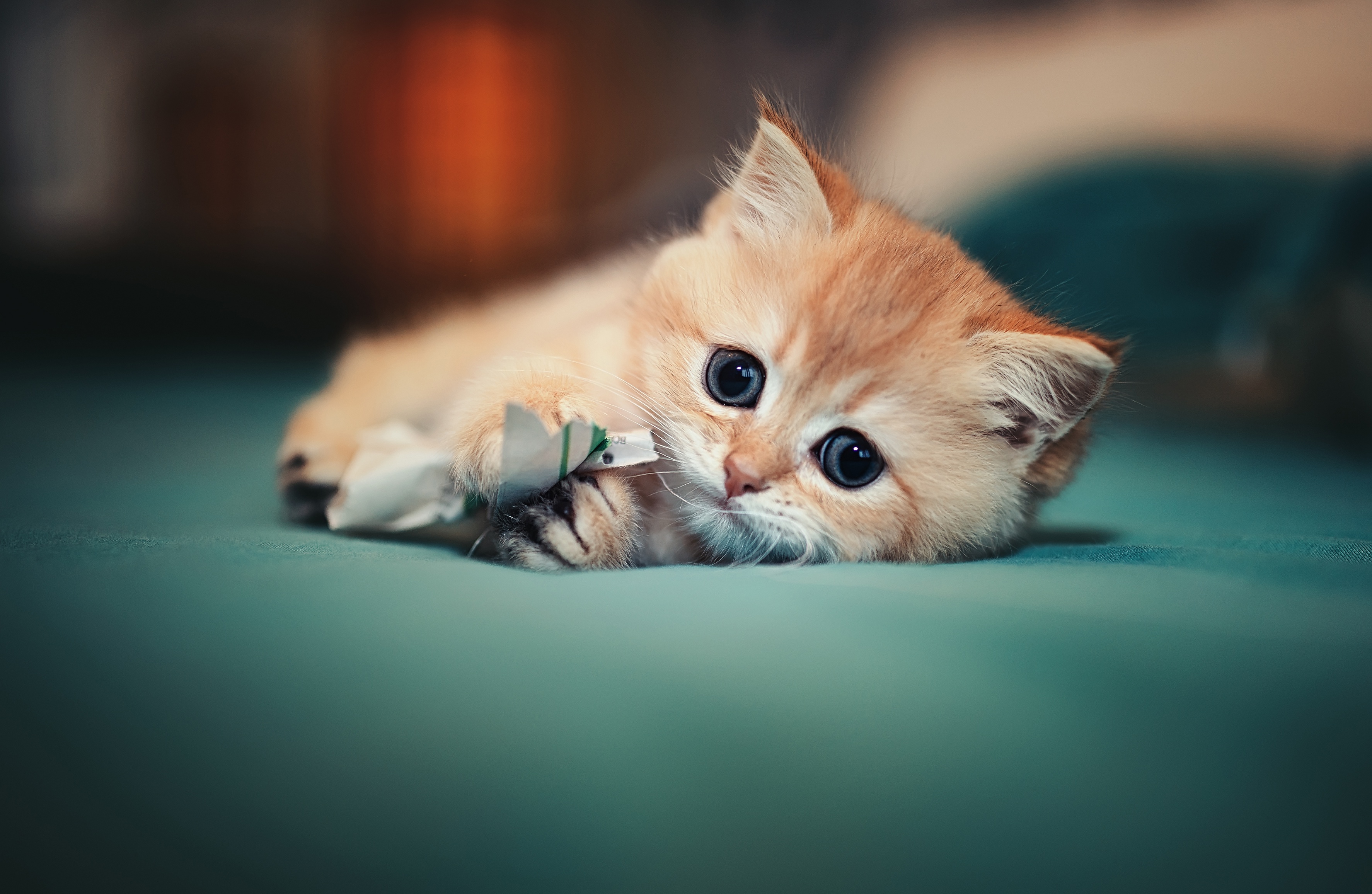 Маленький испуганный котенок играет на кровати - 3549x2313